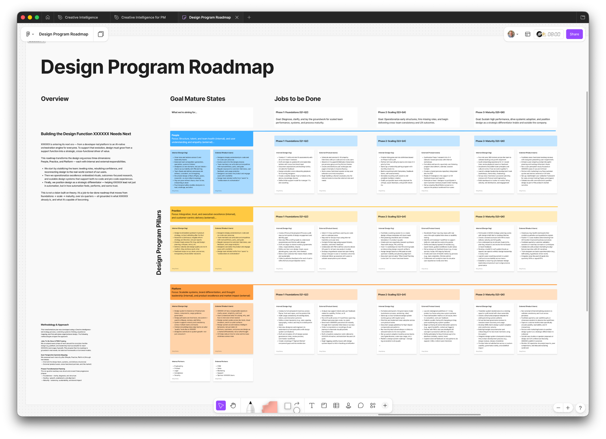 So, I brought up some work that I did last fall as part of an interview for a leadership role in product design. The hiring manager had come up with a rough plan for what they thought the program needed to do in 12–18 months to get design on par with operational maturity and work quality. They provided a high-level overview and in response I offered to come up with a plan from my perspective with the intent of comparing the details. I thought that would be a great way to immediately assess where we are aligned and where we need to collaborate to get aligned.